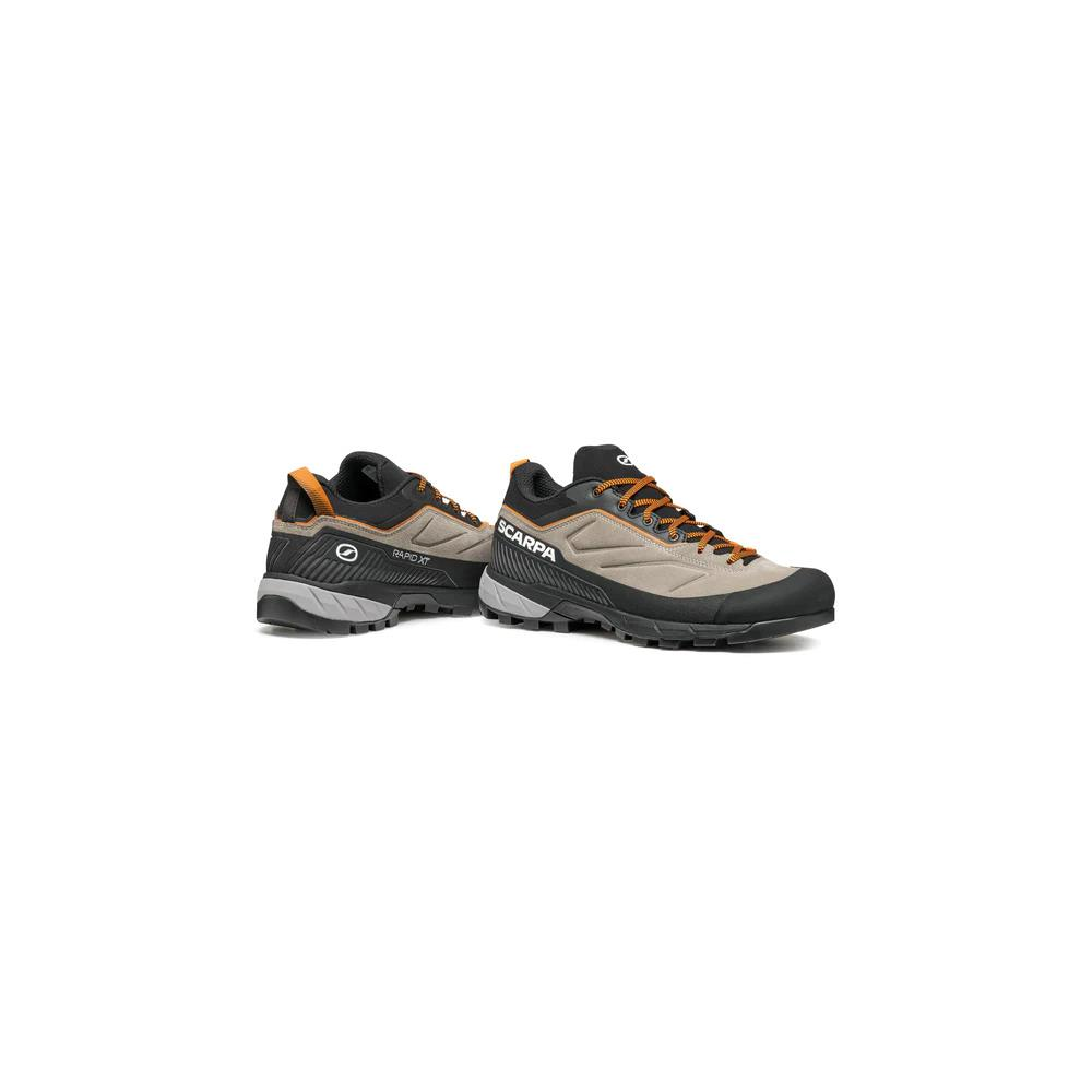 Scarpa RAPID XT to wygodne skórzane buty o prostym designie, odpowiednie do podejść, wędrówek szlakami i lekkich wycieczek górskich. Każdy szczegół został przemyślany, aby zapewnić przyczepność, komfort i ochronę, np. odporny na ścieranie rant ochronny z TPU na całym obwodzie. Podeszwa to Vibram® MegaGrip z strefami wspinaczkowymi na palcach i systemem hamulcowym z tyłu, zapewniającym stabilność i przyczepność. Innowacyjny kształt, szeroki i ergonomiczny w okolicy palców, został zaprojektowany tak, aby dopasować się do kształtu stopy.