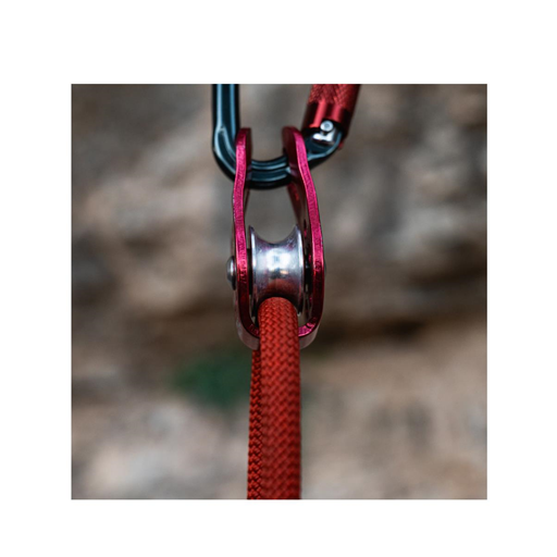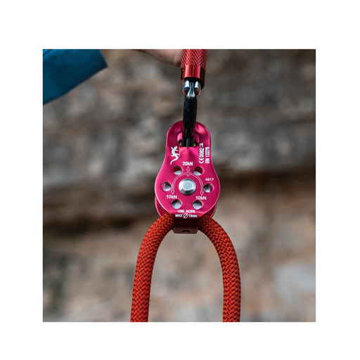 Korpus wykonany z aluminium zapewnia korzystny stosunek masy do wytrzymałości, a prosta konstrukcja ogranicza liczbę elementów podatnych na zużycie. To bloczek do zadań pomocniczych — nie jest przeznaczony do zjazdów tyrolskich ani dynamicznych obciążeń, co jasno określa jego zastosowanie i eliminuje ryzyko niewłaściwego użycia.
