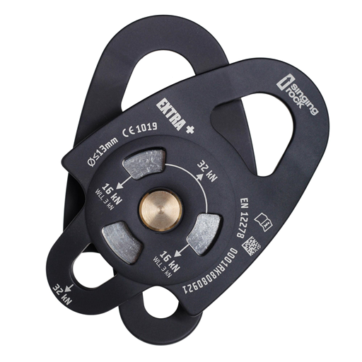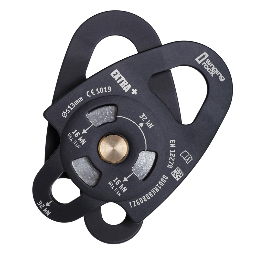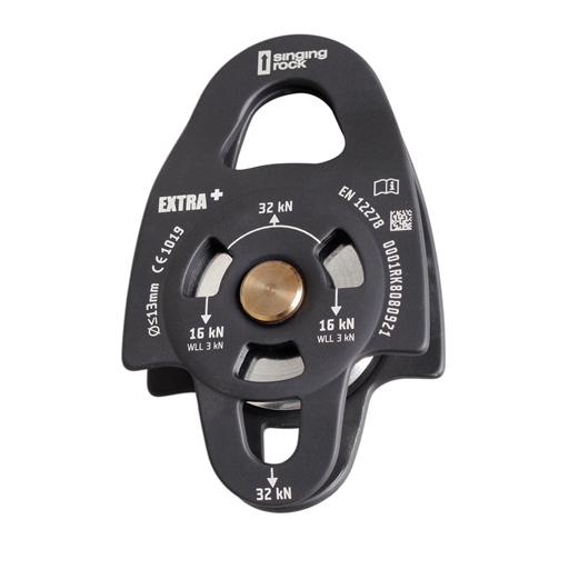 PULLEY EXTRA PLUS to bloczek pojedynczy, dla lin nylonowych, przeznaczony do zastosowań w transporcie pionowym i ratownictwie, o dużej efektywności. Wytrzymały i lekki pojedynczy bloczek do zastosowań przemysłowych i systemów holowniczych do użytku ze statycznymi i dynamicznymi linami tekstylnymi. Ponieważ ma uszczelnione łożysko osi roboczej i dużą średnicę rolki, zapewnia dużą wydajność (na poziomie 94%). Zaprojektowany i zoptymalizowany do użytku z węzłem Prusikowym lub dowolnymi zaciskami. Dlatego, że punkt zawieszenia bloczka jest wyprofilowany, umożliwia wpięcie do trzech karabinków. Aby zapewnić ochronę lin przed kontaktem z niepożądanymi elementami, okładziny boczne odpowiednio wyprofilowano. Ponieważ rolka, oś i pokrywa przeciw kurzowa łożyska kulkowego są scalone szczelnie, zapewniają długą żywotność bloczka. Otwory w płycie bocznej umożliwiają czyszczenie otoczenia łożyska. W bloczku dodano dodatkowy dolny punkt mocowania dla bardziej skomplikowanych systemów o wytrzymałości 32 kN.