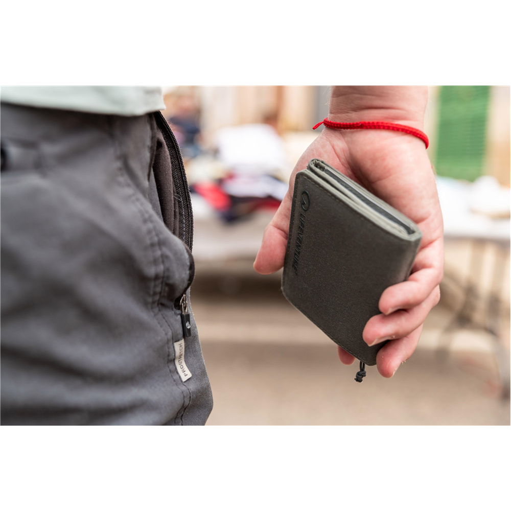 Portfel RFiD Wallet Recycled jest duży i bardzo wygodny. Zmieszczą się do niego dokumenty, pieniądze i karty płatnicze, które potrzebne są zarówno w podróży, jak i na co dzień. Jego zaletą jest ochrona przed nielegalnym dostępem do chipów kart kredytowych, bankomatowych oraz niektórych dokumentów wykorzystujących technologię RFiD.