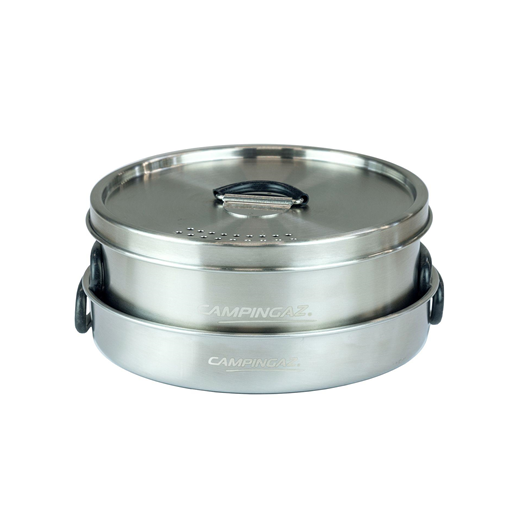 Zestaw 2 lekkich, wykonanych ze stali nierdzewnej garnków turystycznych.