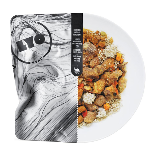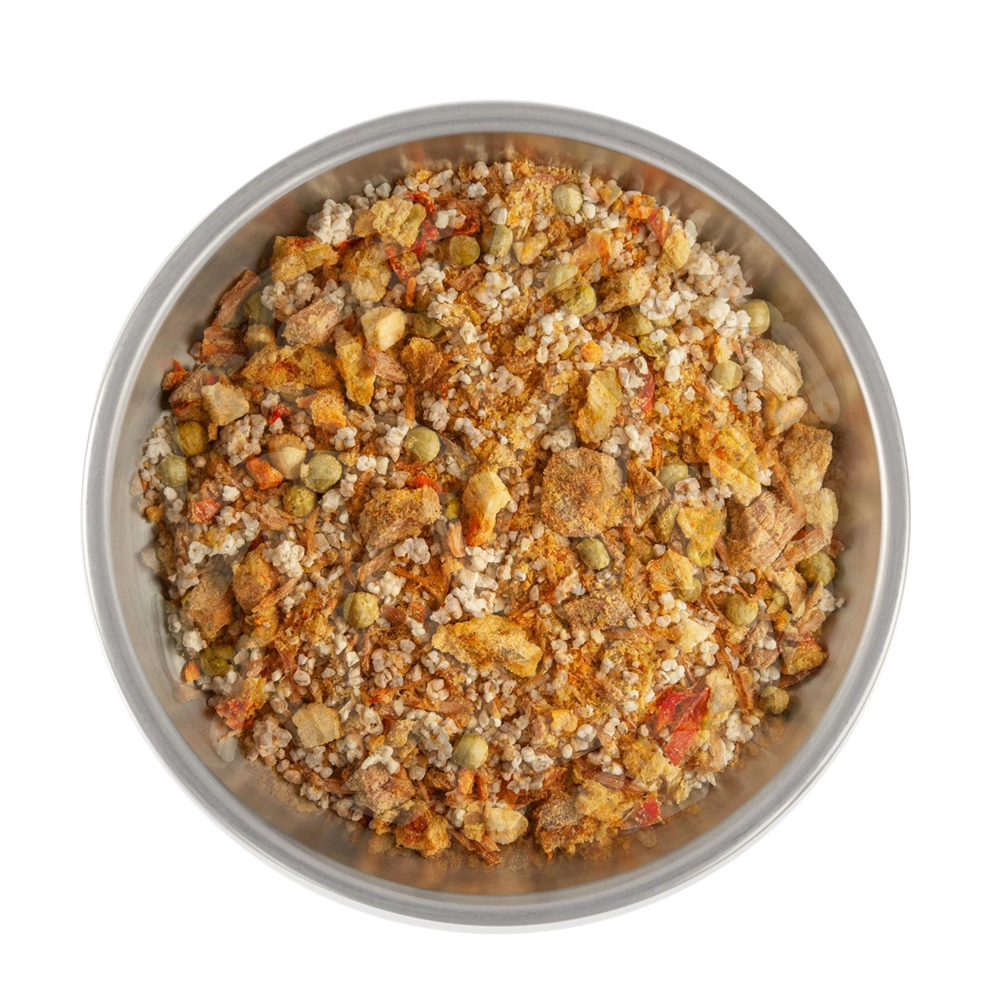 Składniki: mięso wieprzowe (kostka) 36%, kasza jęczmienna pęczak 25%, marchew 5%, papryka czerwona 5%, groszek zielony 5%, pietruszka korzeń 5%, cebula 5%, mąka pszenna, olej rzepakowy, sól, przyprawy (zawiera seler)