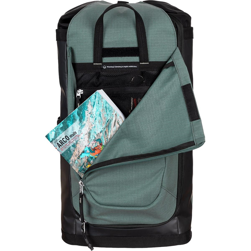 Zaprojektowany z myślą o trwałości, standardowej plandeki i wzmocnionego nylonu ripstop z zamkami YKK®. Nylonowe zamknięcie typu roll-top posiada dodatkową powłokę DWR (Durable Water Repellent) bez PFC, dzięki czemu plecak jest wodoodporny. Łatwość użytkowania i wszechstronność to jego atuty, na przykład szeroko otwierana klapa w kształcie lejka oraz górne zamknięcie klapy, które służy również jako mocowanie liny. Aby zapewnić bardziej stabilne noszenie, boczne paski kompresyjne działają również jako stabilizatory liny lub mogą być ukryte w konstrukcji, gdy nie są używane, aby uzyskać bardziej eleganckie wykończenie.