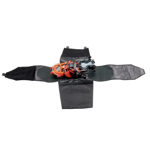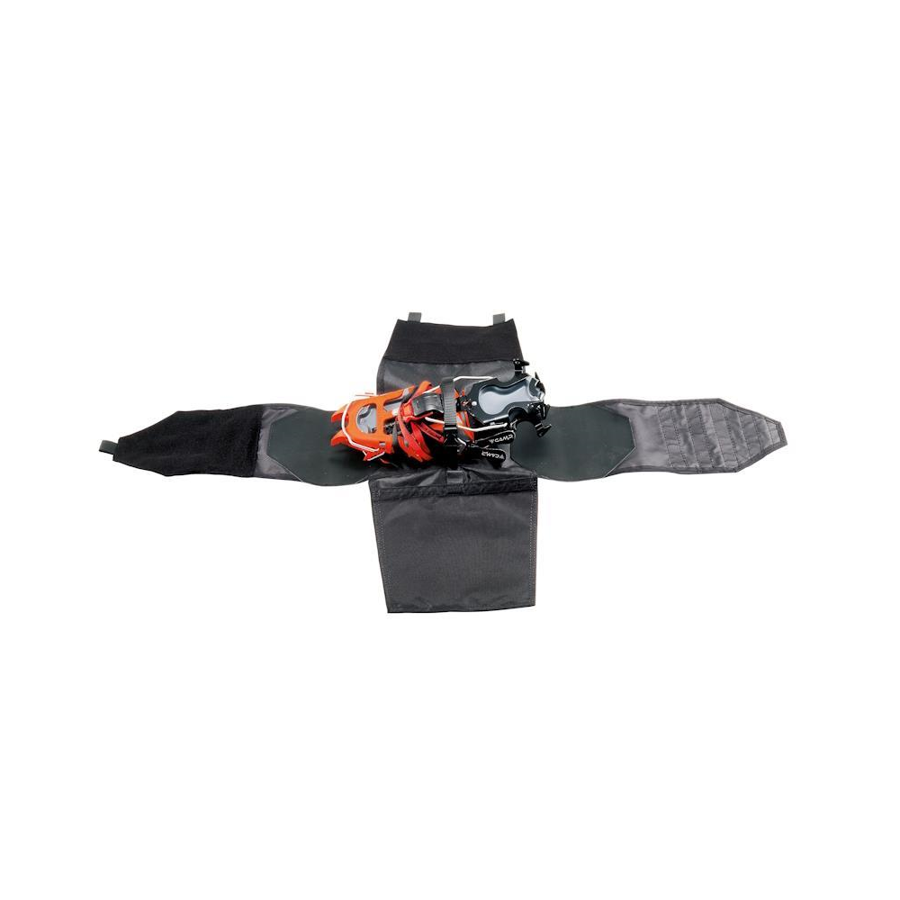 Poręczny, składany pokrowiec na raki z wytrzymałego Nylonu, wzmocniony Hypalonem w miejscach nacisku zębów. Wyposażony w długie zamknięcia na rzep i pasek z klamrą łatwo dopasowuje się do każdej wielkości raków. Zastosowane rzepy Micro Velcro minimalizują czepianie się o paski raków i inne materiały.