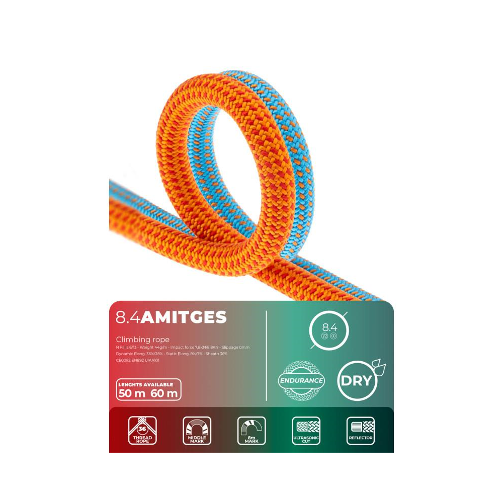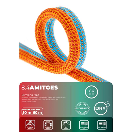 Fixe Climbing Amitges 8.4mm to wytrzymała i trwała lina odpowiednia do wszystkich rodzajów wspinaczki na dużych ścianach. Posiada podwójną standaryzację, podwójną i bliźniaczą. Zapewnia dodatkową ochronę przed wilgocią i większą odporność na kurz i brud dzięki obróbce Dry. Jest zalecana dla alpinistów i wspinaczy poszukujących liny o wysokiej wydajności, najlepiej w warunkach letnich.