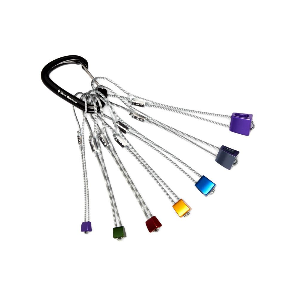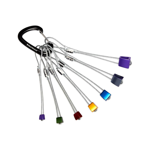 Kości Black Diamond Classic nr 5-11 zamontowane na karabinku HotWire. Klasyczne kości są niezbędnym elementem każdego wspinacza tradowego, zaprojektowanym z poprzecznym stożkiem, który pozwala na boczne umieszczanie w flarach i płytkich pęknięciach. Anodyzowane według rozmiaru, są szybko rozpoznawalne, a zaokrąglone krawędzie ułatwiają usuwanie. Każdy stoper jest wyposażony w wytrzymałą, ocynkowaną stalową linkę.