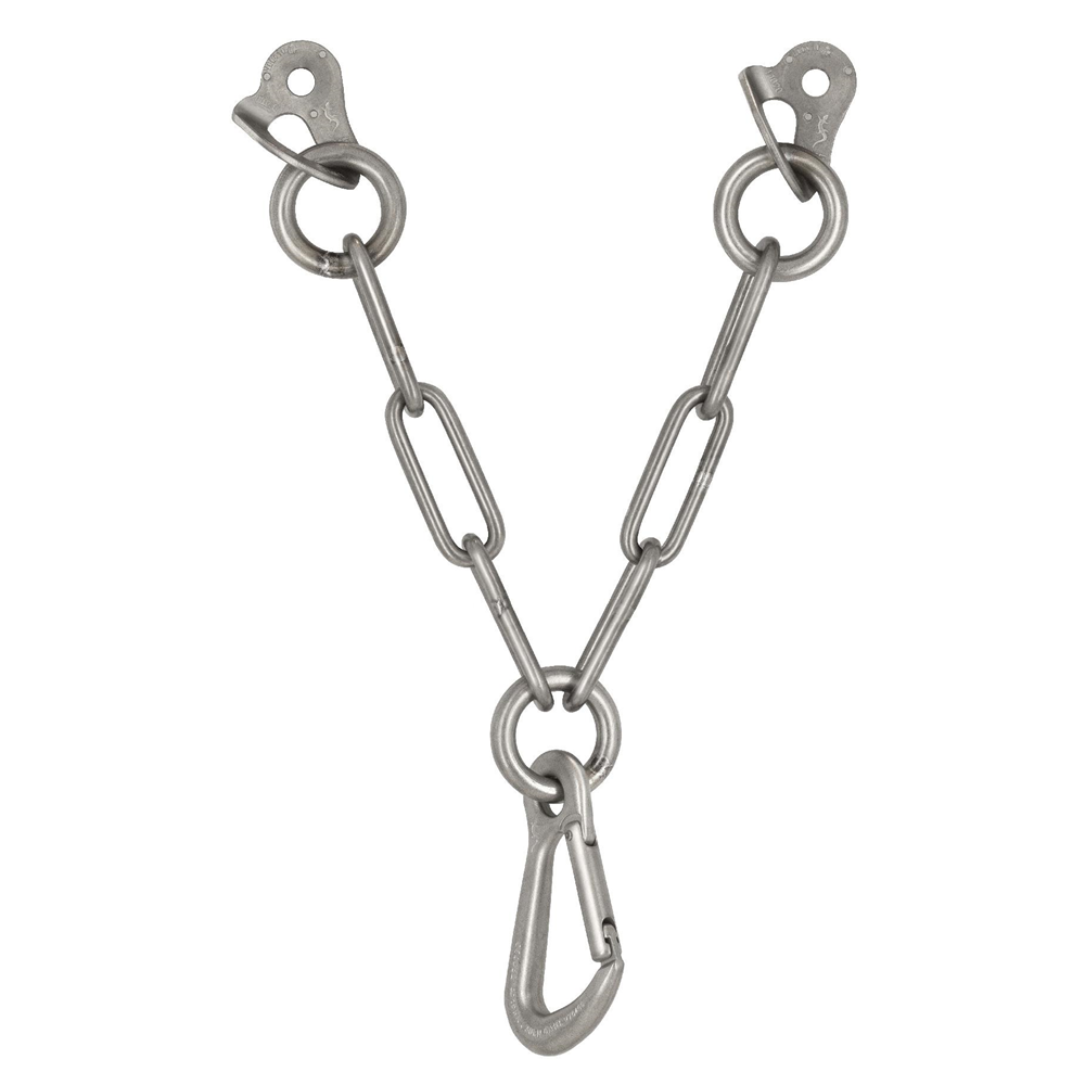 Konstrukcja typu V, oparta na dwóch punktach kotwiących Fixe 1, umożliwia efektywne rozłożenie obciążeń i zwiększa bezpieczeństwo całego stanowiska. Trzyogniwowy łańcuch oraz spawany pierścień ograniczają liczbę punktów krytycznych, a jednocześnie poprawiają ergonomię pracy z liną i karabinkami. Całość została zaprojektowana tak, aby minimalizować zużycie elementów podczas intensywnej eksploatacji.