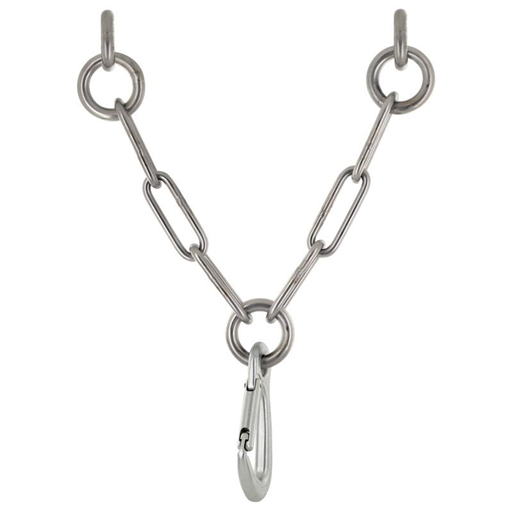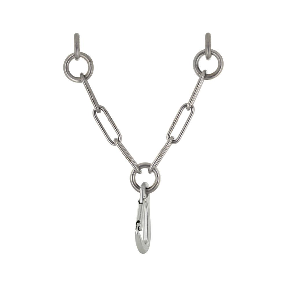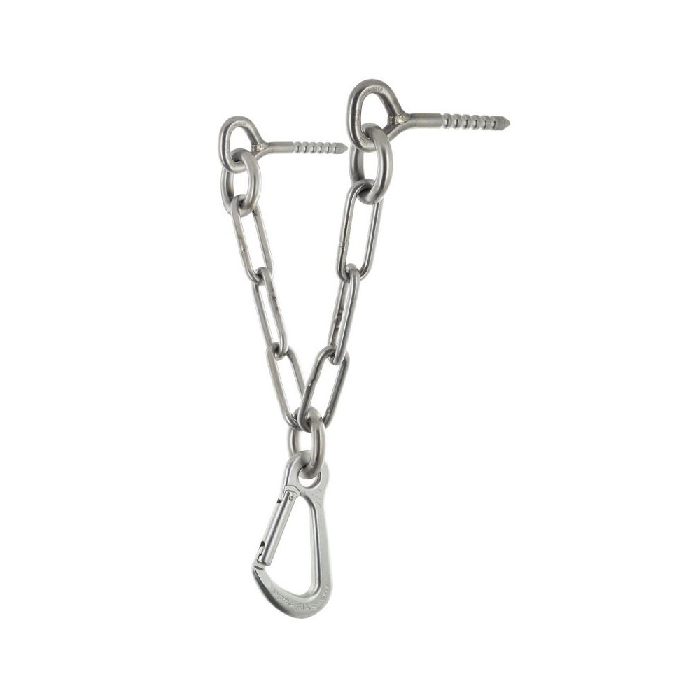 Konstrukcja oparta jest na dwóch kotwach wklejanych (glue-in) o różnej długości — krótkiej i długiej — co pozwala na optymalne rozłożenie obciążeń i stabilną pracę stanowiska podczas asekuracji oraz zjazdów. Centralny pierścień i trzyogniwowy łańcuch ograniczają liczbę punktów krytycznych, a jednocześnie poprawiają ergonomię pracy z liną.